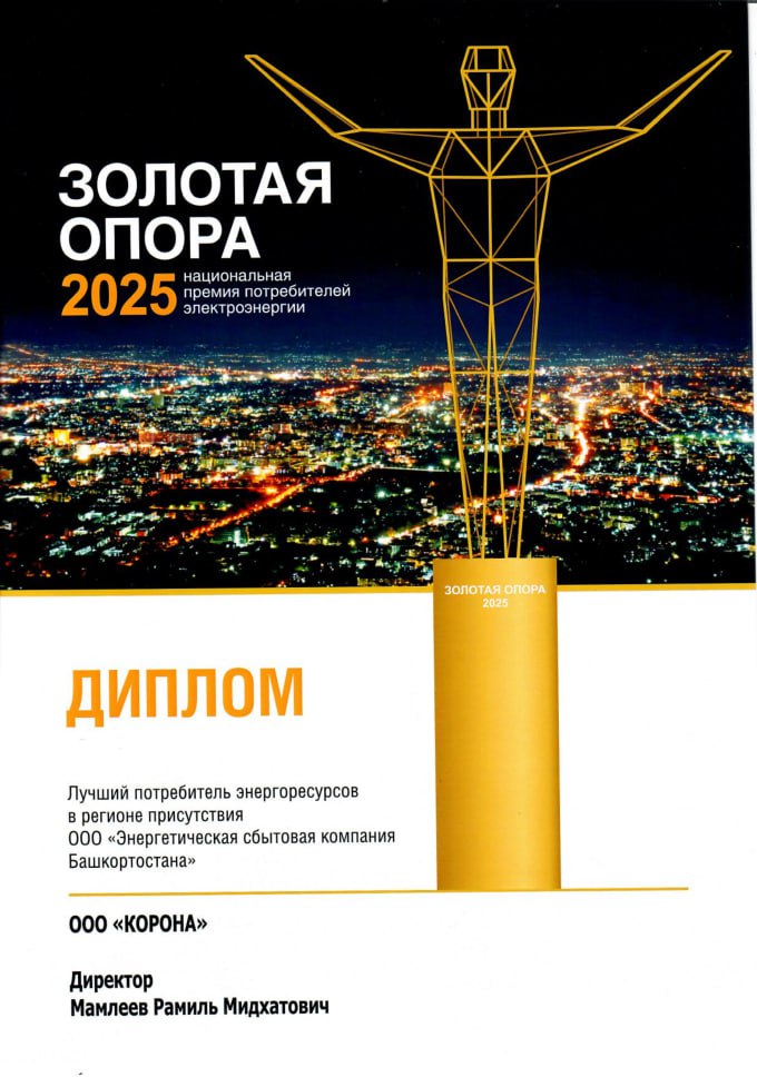 Уфа, декабрь 2025 года. — Мебельная фабрика «Корона» завершает год значительным достижением — получением диплома и звания «Лучший потребитель энергоресурсов в регионе присутствия ООО «ЭСКБ». Эта награда является частью авторитетной всероссийской премии «Золотая Опора-2025», которая отмечает самых добросовестных и прогрессивных потребителей электроэнергии.